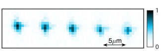 Image Caption: Image of an optical tweezer array of single molecules. The tweezer traps have a spacing of about 5 um and contain single molecules at temperatures of ~30uK.