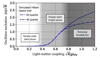 As discovered in the 1970s, for strong enough coupling the Dicke model exhibits a phase transition between a dark phase, where the atoms do not emit any light, and a bright phase where the system strongly radiates, the so-called “superradiance.”