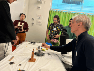 During Harvard’s SEAS BRIDGE week, CUA students and faculty presented demos to high school students. Haley Hguyen and Nik Gjonbalaj presented on resonances and helped students try to install electrodes in a simulated vacuum chamber. Michal Szurek and Annie Zhi showed students how to make holograms. Arian Jadbabaie, Wolfgang Ketterle, and Arjun Pillai demonstrated YBCO superconductors as Jean Dao photographs. Not shown: Anna Knoerr and Conner Williams gave a spectroscopy demo.